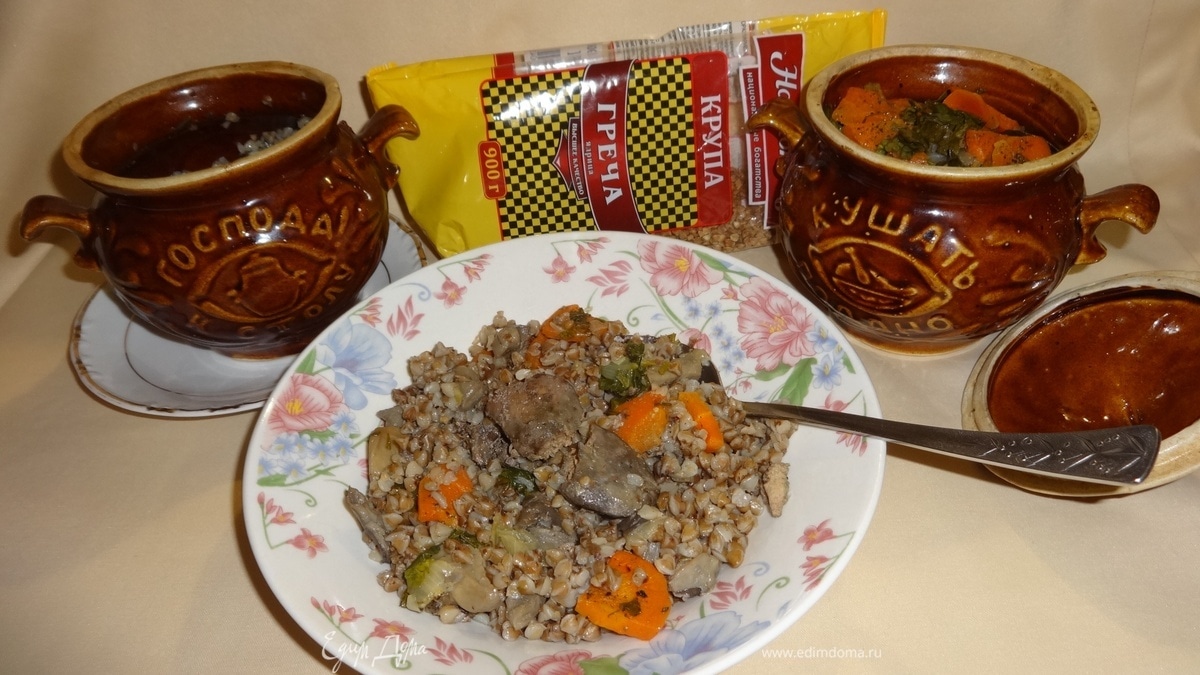 Выложить грибы вместе с жидкостью в горшочки поверх гречки, посолить.
