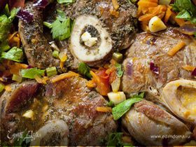 Вяленые помидоры нарезать на кусочки, добавить в жаровню к мясу. Неплотно закрыть крышкой жаровню, оставив щель, чтобы был выход для пара. Поставить жаровню в духовку на 3 часа 30 минут. Через 20–30 минут после начала приготовления в духовке температуру снизить до 165°C. Один-два раза проверить, как идет процесс приготовления. На поверхности жидкости дожны быть совсем легкие пузырьки, перемешать. Выключить огонь, жаровню вынуть из духовки. У вас должны получиться густой насыщенный соус и мягкое ароматное мясо.