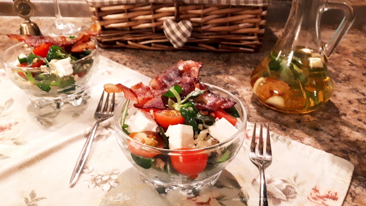 Теплые салаты традиционны для европейской кухни и набирают все большую популярность. Булгур, бекон, помидоры черри и сыр фета отлично дополняют друг друга, а завершают этот фуд-союз любимая зелень и оригинальная заправка. Это салат-конструктор: количество ингредиентов можно брать по своим предпочтениям, а подавать либо в большом салатнике, либо порционно.