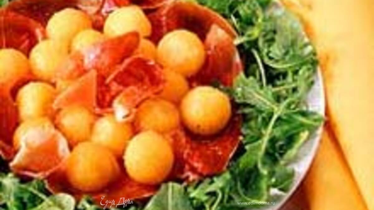 - Шаг 1Дыню разрезать пополам, вынуть семена. Мякоть вынуть специальной ложкй, чтобы получились шарики (или нарезать дыню кубиками).Сыровяленую ветчину нарезать тонкими полосками.Руколу и салат корн вымыть, разложить на блюде.Выжать сок половины лимона, смешать с оливковым маслом, посолить и поперчить.# Выложить на листья салата шарики дыни, полоски ветчины, полить заправкой. Посыпать салат листиками майорана.