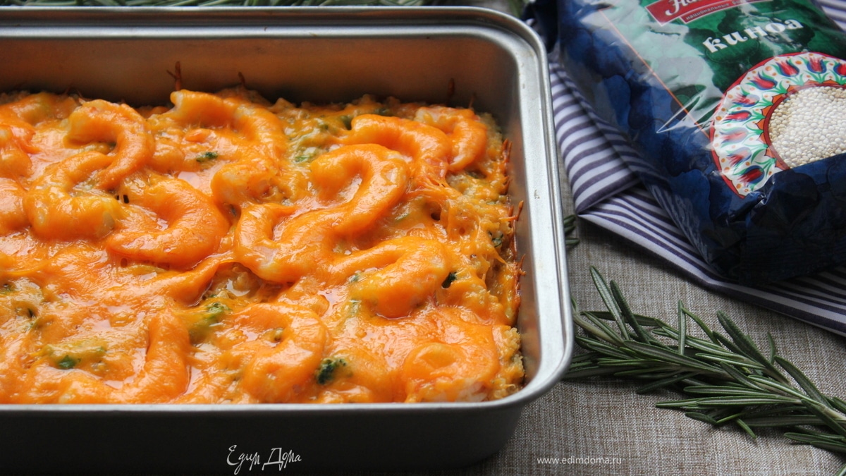 Киноа и овощи в восхитительном соусе под нежными креветками и золотистой корочкой чеддера. Идеальное блюдо для праздничного стола.