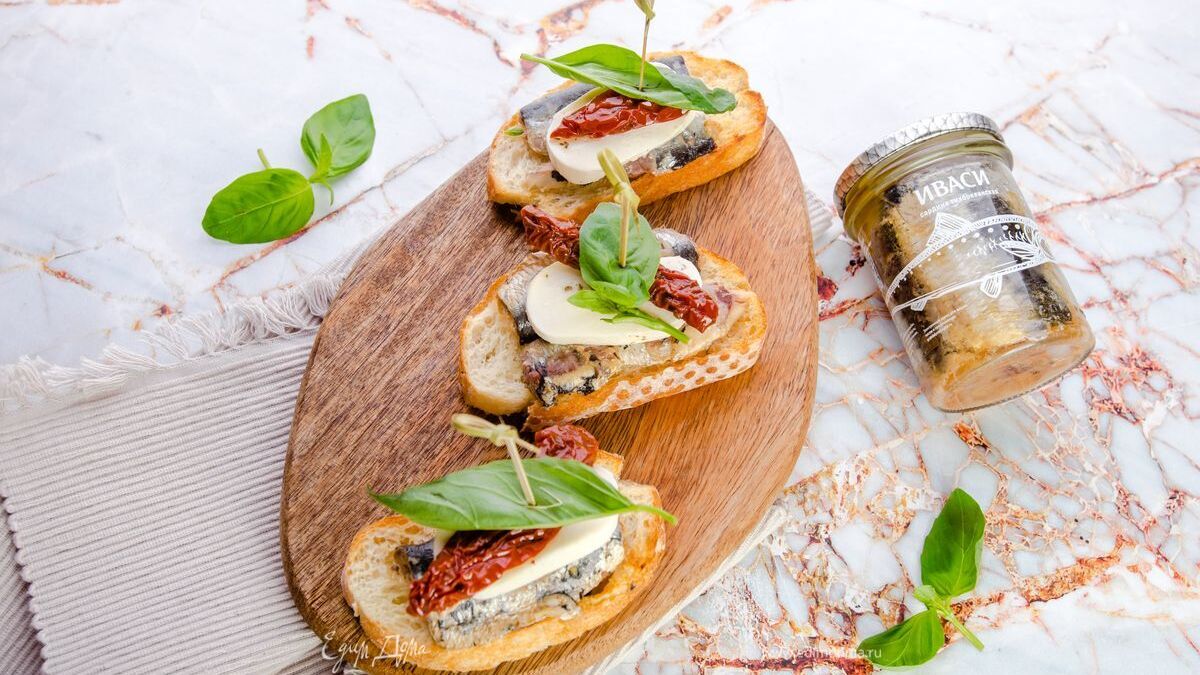 Брускетты с сардинами, вялеными томатами и базиликом