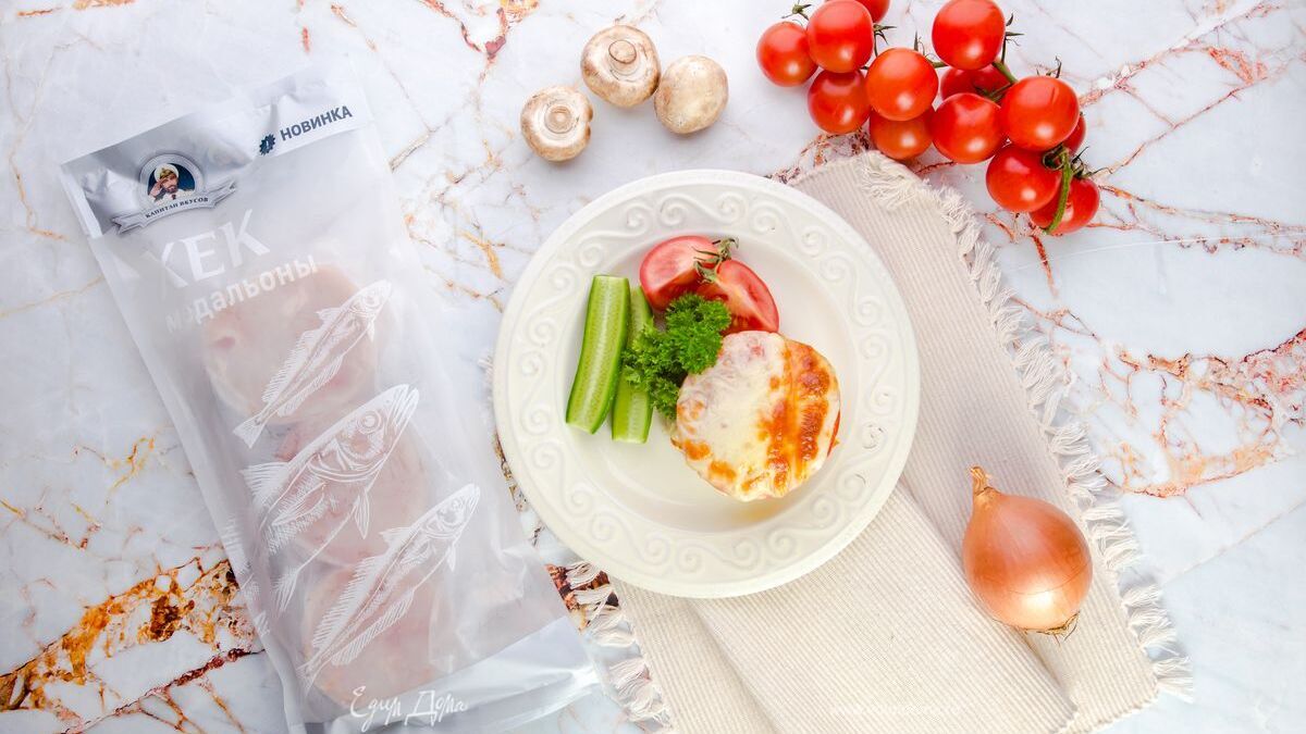 Разморозьте филе хека ТМ «Капитан Вкусов», посолите и поперчите. Застелите противень пергаментом, выложите рыбу, сверху – шампиньоны, лук, помидоры и моцареллу.