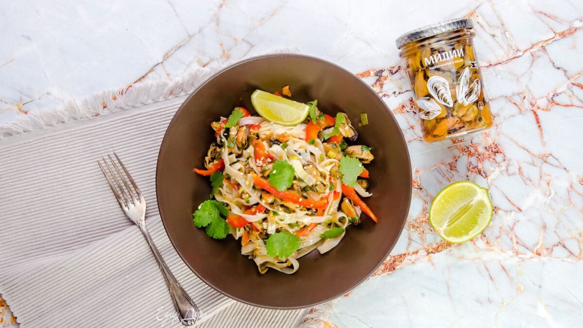 Откройте подкопченные мидии ТМ «Капитан Вкусов», слейте лишнюю жидкость, добавьте к остальным ингредиентам в сковороду. - Шаг 7