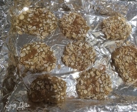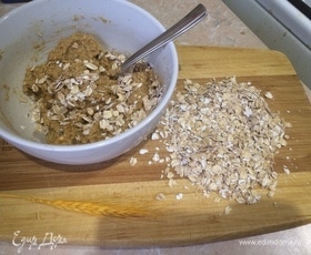 На стол или доску насыпьте хлопья геркулеса. Скатываем шарики и обваливаем в хлопьях.