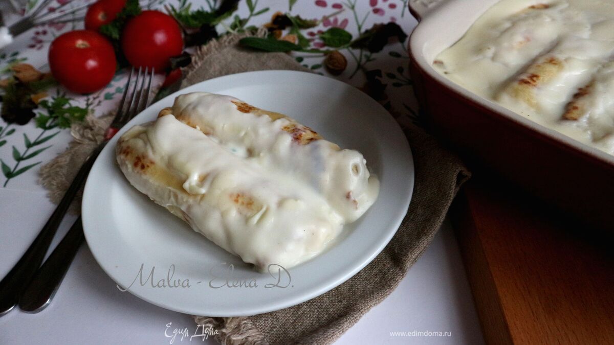 Залить блины соусом бешамель. Отправить в духовку на 20 минут.