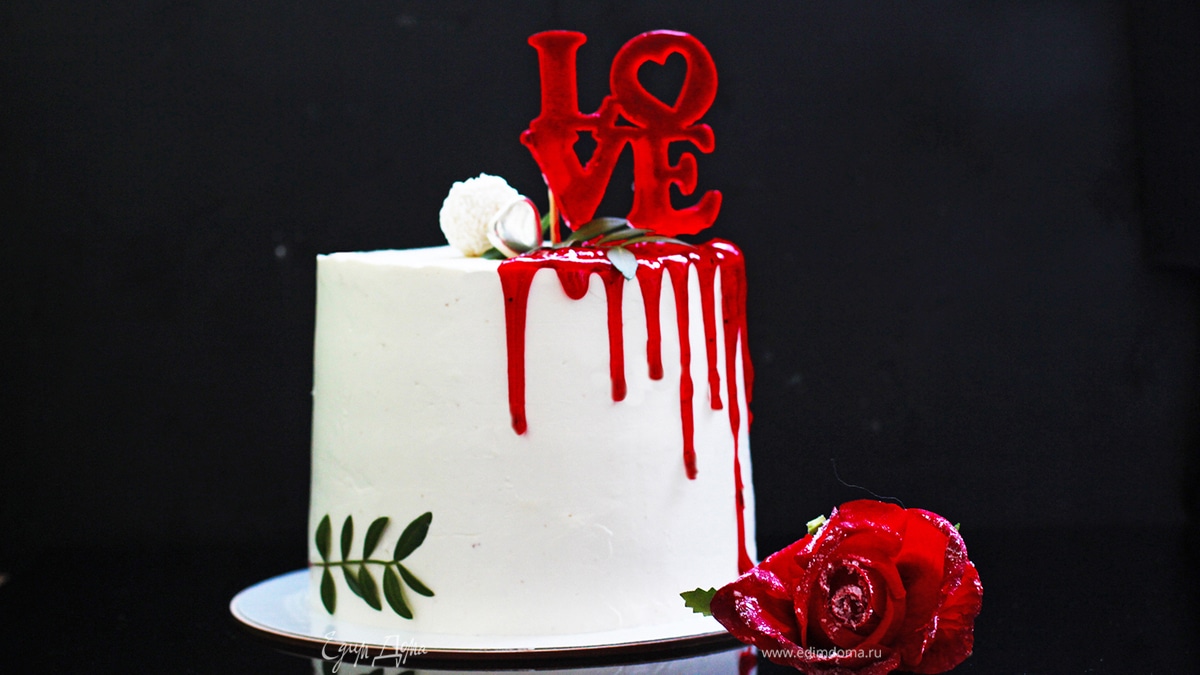 Очень легкий и нежный высокий торт с ярким акцентом из двух кислых ягодных прослоек. Мой торт украшен, как валентинка (красная глазурь, карамельный топпер), но этот рецепт очень хорош для детских тортов, ягодную прослойку в этом случае можно убрать, если детям не нравится кислый вкус, или сделать конфи из сладкой клубники или малины.