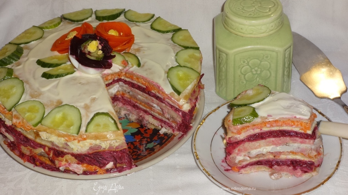 Закусочный блинный торт «Селедка в пеленках» готов! Вид сверху.