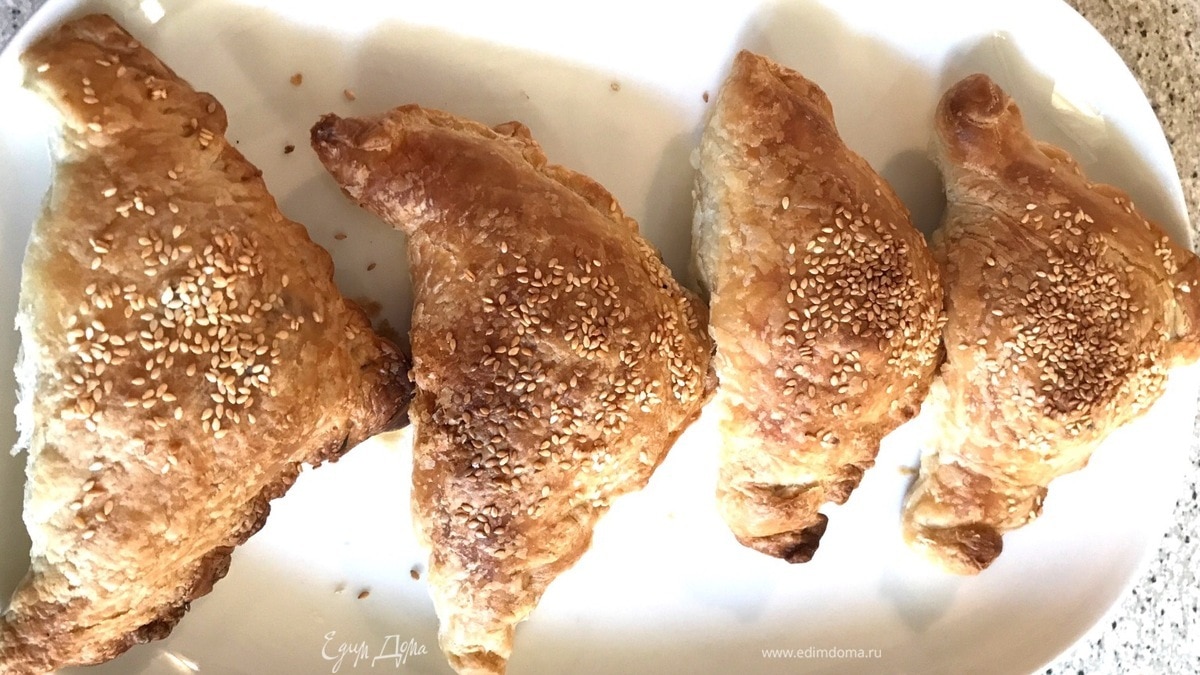 В тесто положить фарш. Слепить треугольник. Защипнуть края (или примять вилкой). Сделать пару проколов сверху деревянной палочкой или вилкой (аккуратно). Посыпать кунжутом. Выпекать 30–35 минут. Посматривайте — готовность зависит от возможностей вашей духовки. - Шаг 5