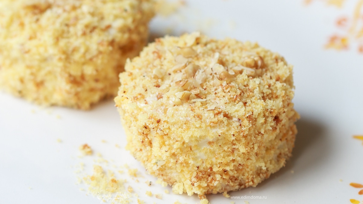 Традиционно кружочки склеивают между собой кремом и посыпают крошкой. Мне же больше нравятся маленькие однослойные пирожные, поэтому я просто макаю каждый кексик в крем и посыпаю крошкой. - Шаг 11