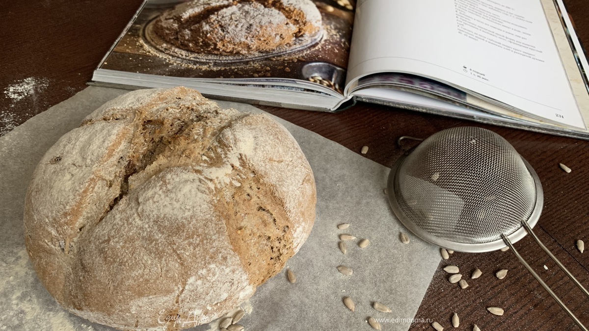 Посыпать пшеничной мукой форму для выпечки или противень и выложить тесто, сформировав круглый хлеб. Сделать на тесте глубокий надрез крест-накрест, посыпать мукой и выпекать хлеб в разогретой духовке 40–45 минут. Приятного всем аппетита!