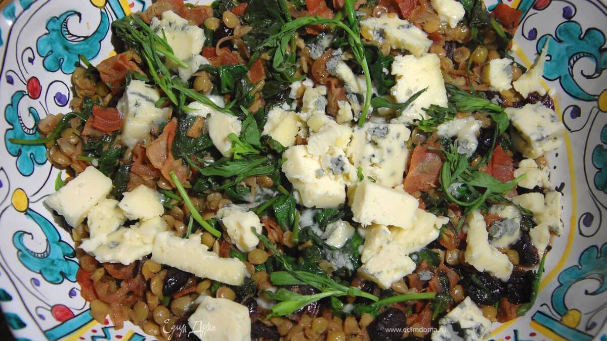 Я очень люблю чечевицу, и, кстати, воду, в которой она варилась, лучше не выливать, а приготовить на ее основе какой-нибудь суп. Вишню можно заменить вяленой клюквой, можно даже обойтись изюмом, но с вишней очень вкусно, поверьте! Вместо бекона подойдет сало, главное, чтобы оно было подкопченным и в нем было побольше мясных прослоек. Не любите сыр с плесенью — натрите вместо него твердый, а можно и вообще обойтись без сыра. Подавать такую чечевицу очень вкусно с жирным йогуртом или сметаной.