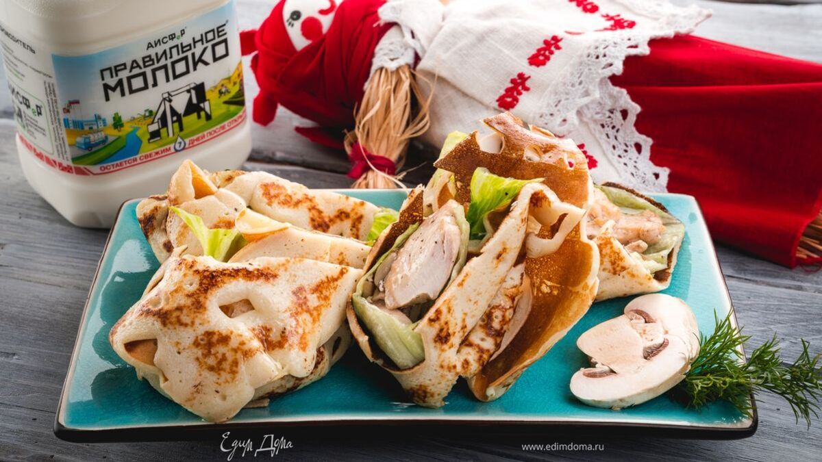 Сверните блины в рулет, разрежьте их пополам и подавайте к столу. Приятного аппетита!