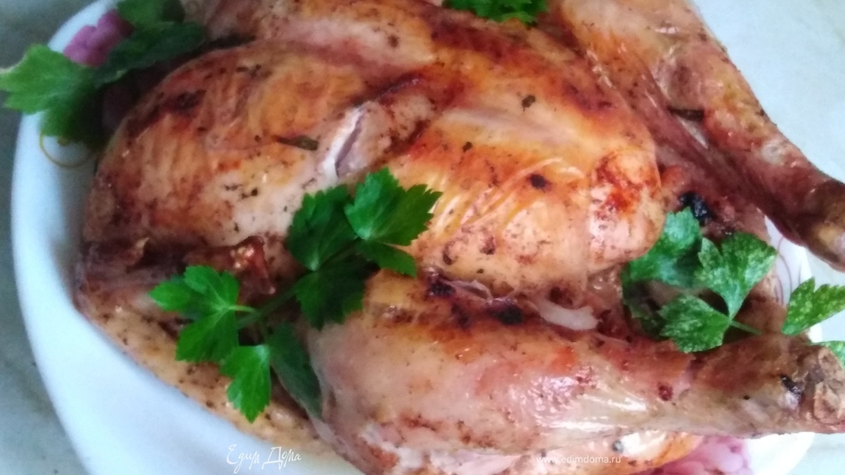 Чеснок очистить, разделить на дольки. Каждый зубчик разрезать вдоль пополам. По всей тушке курицы сделать проколы ножом. В каждый прокол уложить кусочек чеснока. Перец, соль, паприку, базилик смешать. Натереть курицу смесью специй снаружи и внутри. Уложить в посуду. Накрыть пленкой и оставить в холодильнике на ночь. - Шаг 2