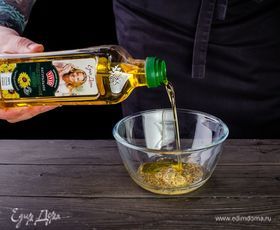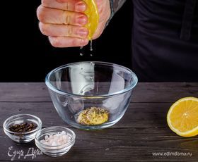 В емкости соедините лимонный сок, горчицу, соль, перец и прованские травы.