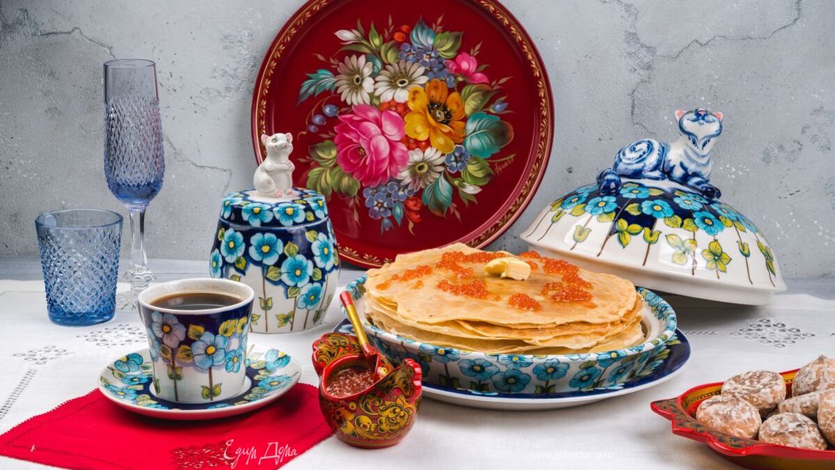 в новой блиннице из серии «Все коту масленница. Незабудки» от «Гжельского фарфорового завода».Для оформления стола используйте столешник и салфетки от «Крестецкой строчки». Прекрасно дополнят сервировку бокалы от «Гусевского хрустального завода им. Мальцова», икорница и лоточек от фабрики «Хохломская роспись». Буйство красок на подносе от «Жостовской фабрики декоративной росписи» напомнит о приближении лета. Приятного аппетита!