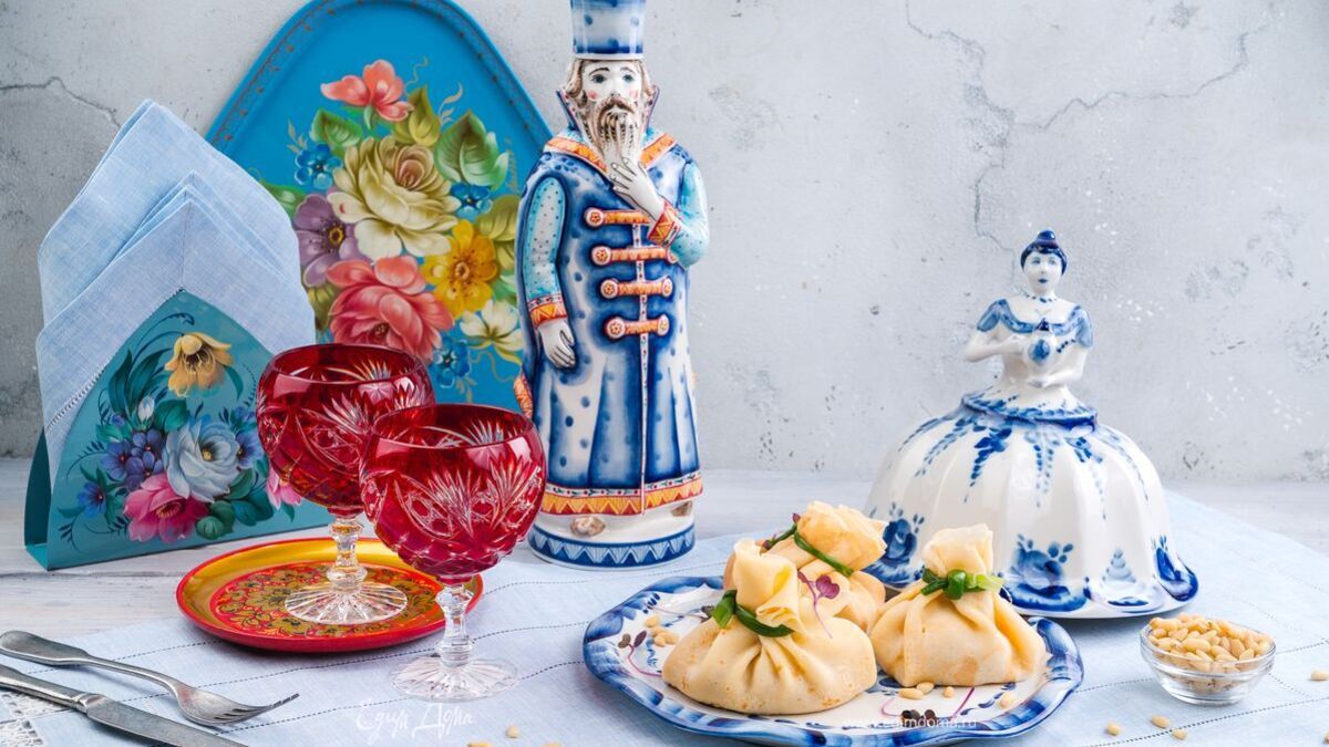Украсьте стол столешником и салфетками «Крестецкая строчка». Праздничное блюдо подавайте в блиннице «Хозяюшка» от «Гжельского фарфорового завода». Для напитков используйте штоф «Боярин» вместе с фужерами от «Гусевского хрустального завода им. Мальцова». Салфетница и поднос от «Жостовской фабрики декоративной росписи» и тарелочки от фабрики «Хохломская роспись» добавят праздничного настроения. Красивое и вкусное праздничное блюдо порадует ваших родных и гостей!