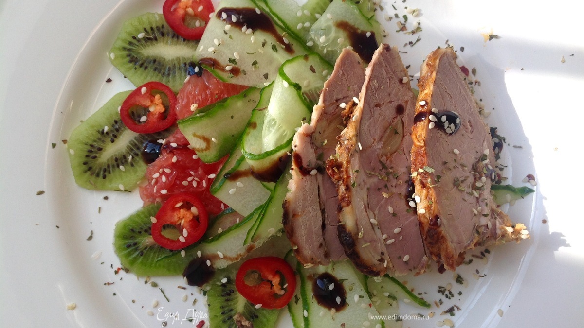 Выкладываю подложку: на центр тарелки — лук, накрываю его грейпфрутом, по кругу кладу киви, затем — огуречные ленты, перец острый и сверху — кусочки буженины. Сверху поливаю бальзамическим соусом, оливковым маслом, солю, посыпаю кунжутом. Приятного аппетита!