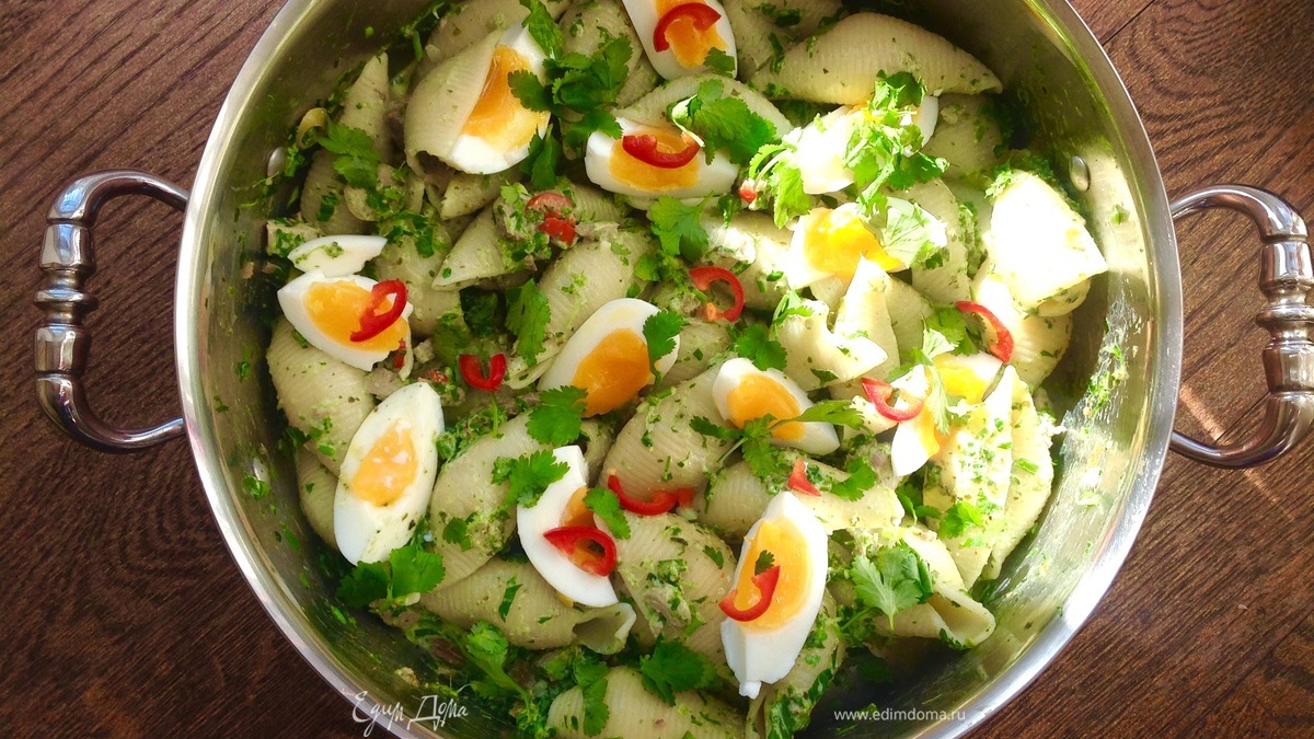 Вареные яйца нарезаю и добавляю к пасте. Сверху украсил листиками кинзы (по желанию). Приятного аппетита!