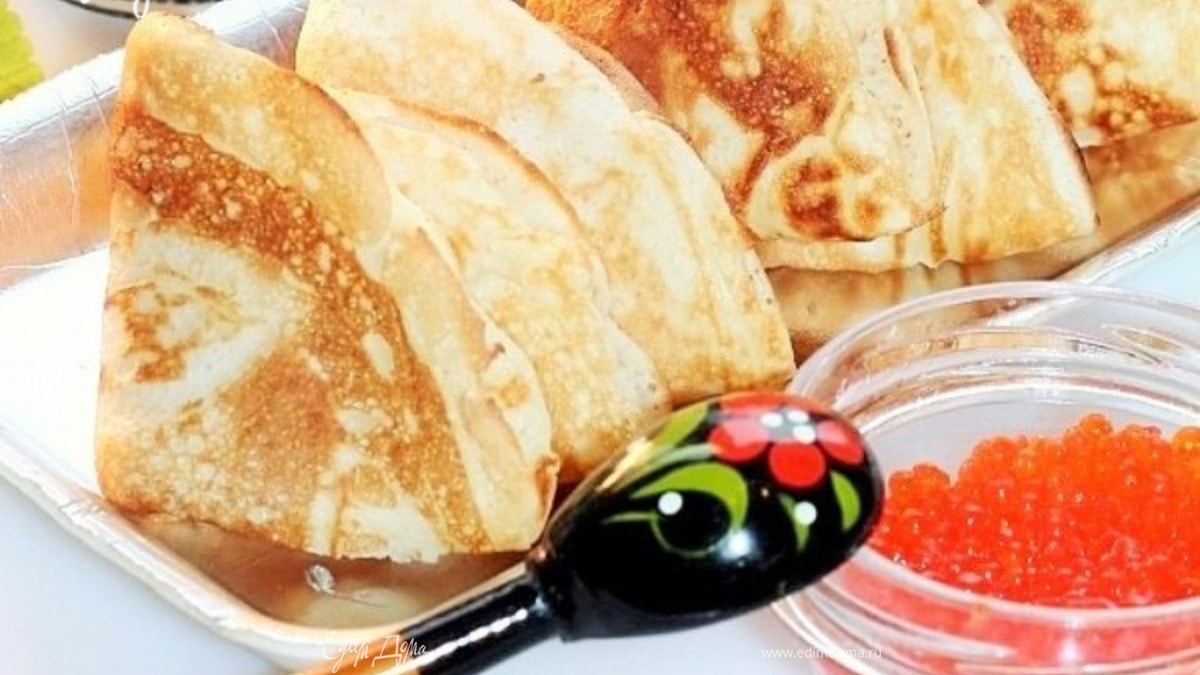 Вкусные мягкие блинчики на дрожжах и молоке. Начинка — красная икра. Готовятся блины просто и легко!