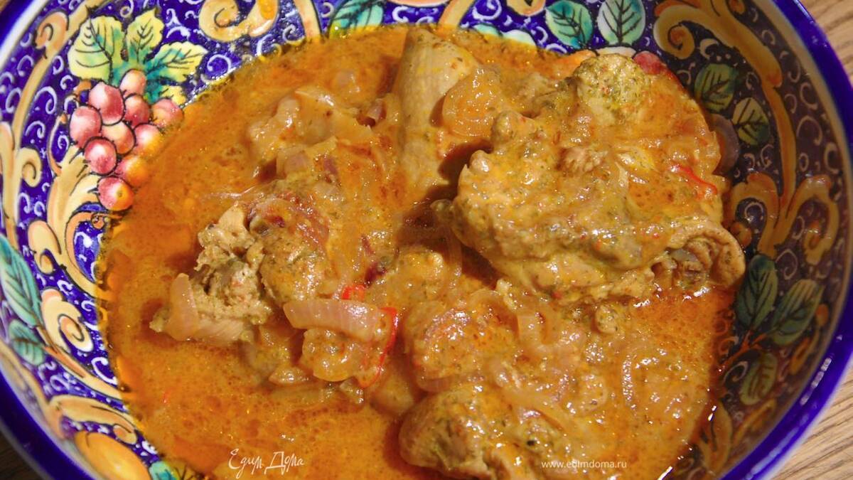 В сковороду, где жарился лук, выложить куриные бедра в маринаде и обжаривать с одной стороны до появления золотистой корочки, затем перевернуть, добавить лук, полить все кокосовым молоком, накрыть крышкой и готовить на небольшом огне около 25 минут.