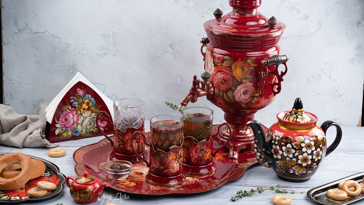 Полезный ароматный чай готов! Для красивой подачи великолепно подойдет набор с самоваром, кованым подносом и подстаканниками от «Жостовской фабрики декоративной росписи» и хрустальными стаканами от «Гусевского хрустального завода им. Мальцова». Приятного чаепития!