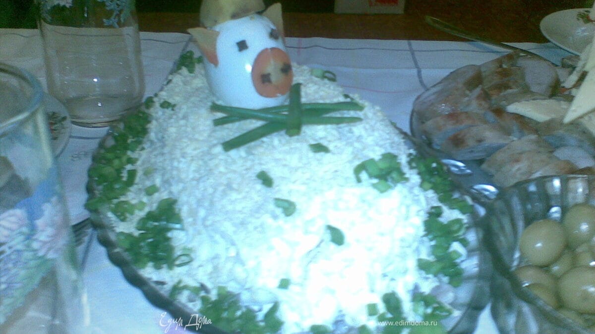 - Шаг 1Яйца сварить вкрутую. Белки натереть на крупной терке, желтки — на мелкой. Сыр натереть на мелкой терке. Лосося порезать кубиками. Сливочное масло заморозить и натереть на крупной терке. Лук мелко порубить. Выложить в салатник слоями подготовленные яичные белки, сыр, половину нормы лосося, сливочное масло, лук, затем оставшегося лосося. Каждый слой полить майонезом, смешанным с заливкой от лосося. Сверху залить оставшимся майонезом и посыпать тертыми желтками. До подачи на стол держать в холодильнике. Перед подачей оформить зеленью. Украсить по вкусу.