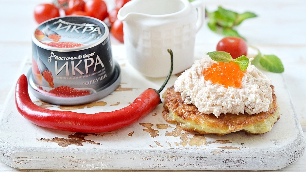 С чем же еще подавать картофельные блины, как не с икрой? Только предлагаю не просто ограничиться икрой, а сделать из икры мусс: очень нежный, слабосоленый — он прекрасно подойдет не только к драникам, но и к любым блинам.