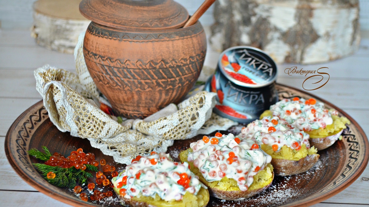 Сметанно-икорный соус выложите на еще теплый картофель и тут же подавайте к столу. Приятного вам аппетита!