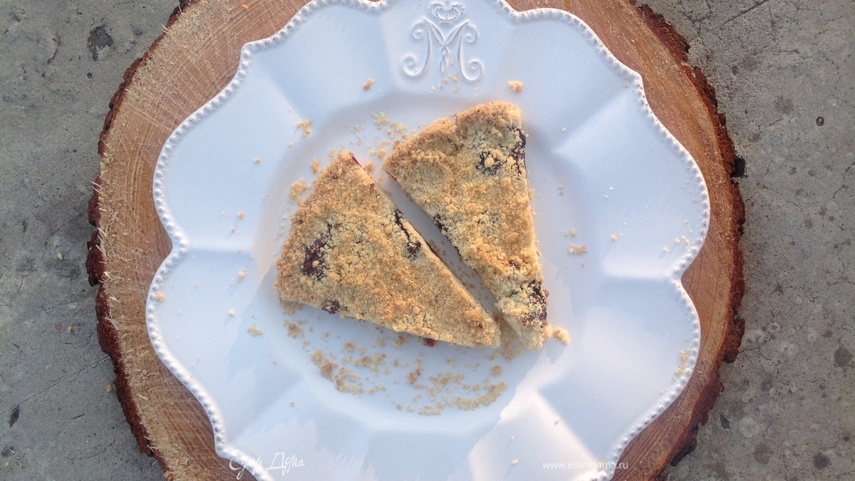 В форме делаю «французскую рубашку». Насыпаю половину мучной крошки. Затем — черничный джем, сверху — снова крошку. Ставлю в духовку минут на 25–30. - Шаг 4