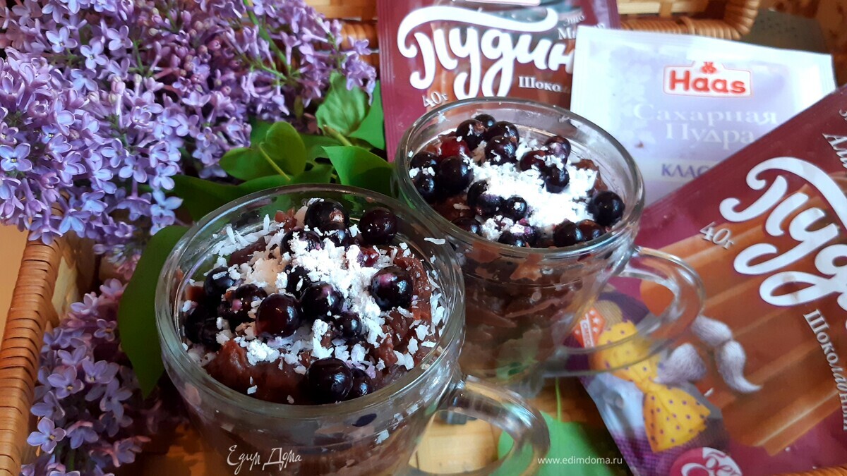 Достаем стаканы, перекладываем в них черную смородину с сахаром и кокосовую стружку, а сверху подготовленный пудинг. Ставим в холодильник охлаждаться. - Шаг 4