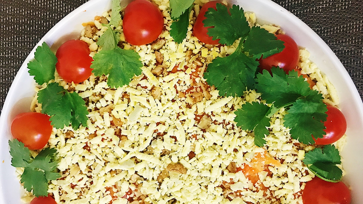 Выкладывать салат слоями: картофель, белки, тунец, морковь, орехи, желток. Сметану посолить и поперчить — промазать ей слои. По периметру разложить половинки помидорчиков черри срезами вниз, расположив между ними зелень петрушки.⠀⠀⠀⠀⠀⠀⠀⠀⠀⠀⠀⠀⠀⠀