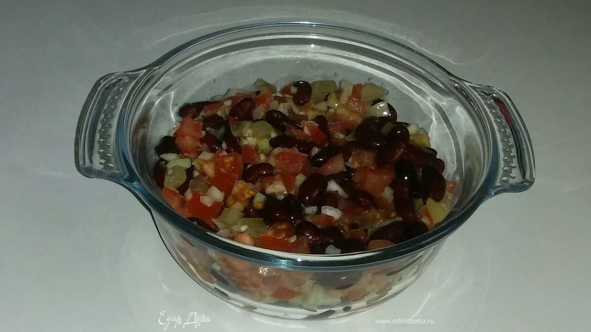 Кладем в отдельную емкость лук, помидоры, фасоль и добавляем заправку для салата. Все перемешиваем. Салат можно есть сразу, но лучше поставить его на 1 час в холодильник. Приятного аппетита!