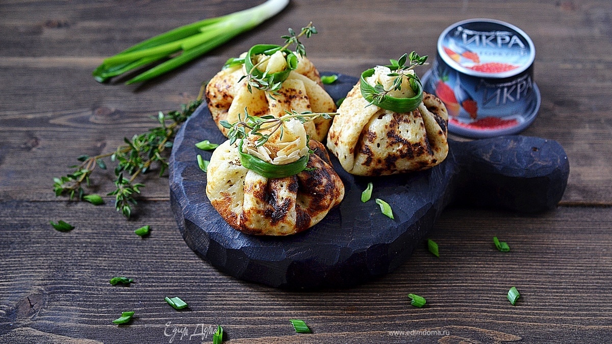 Блинные мешочки с начинкой — интересная порционная закуска! Украсит, несомненно, праздничный стол, в том числе и масленичный. Жюльен мы приготовим из морепродуктов