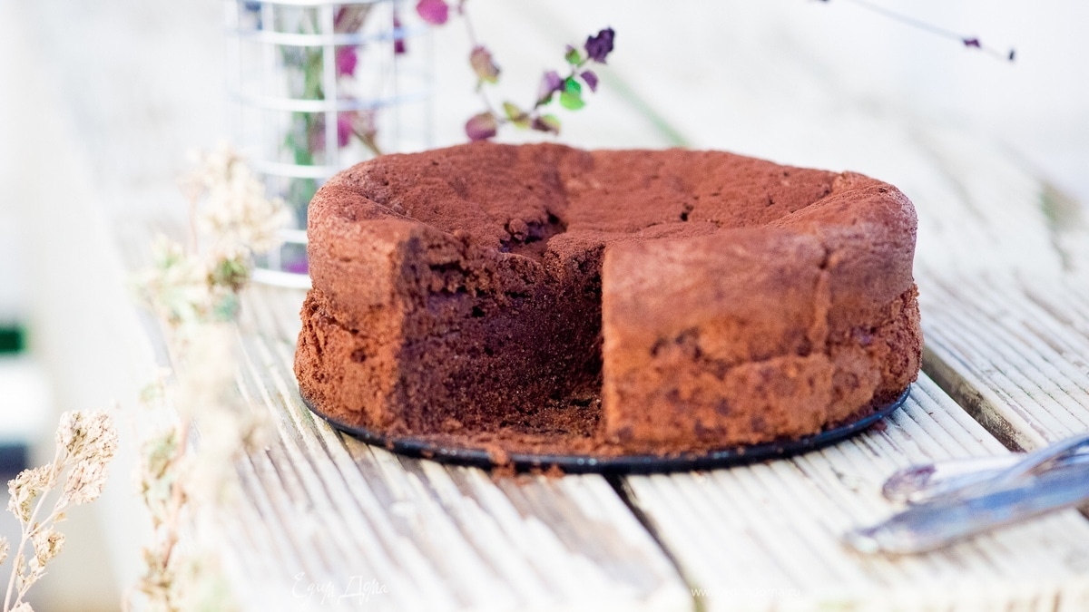 Очень шоколадный и очень быстрый в приготовлении. Это практически шоколадный трюфель. Самодостаточен, но при желании можно разрезать и смазать любым не очень сладким конфитюром.