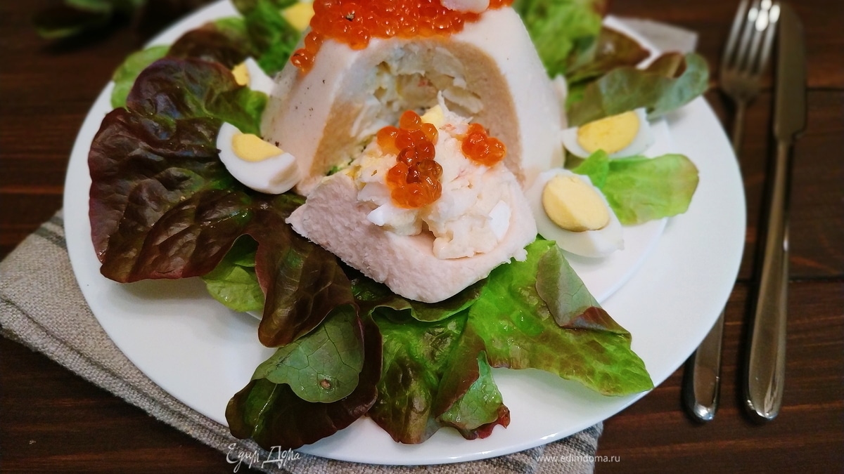 Мусс украсьте сверху красной икрой, креветками и перепелиными яйцами. Приятного аппетита.