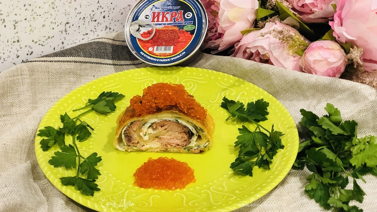 Сверху на пирог выложите красную икру ТМ «Восточный берег», вкус у икры потрясающий. Пирог получается сочным и очень вкусным.