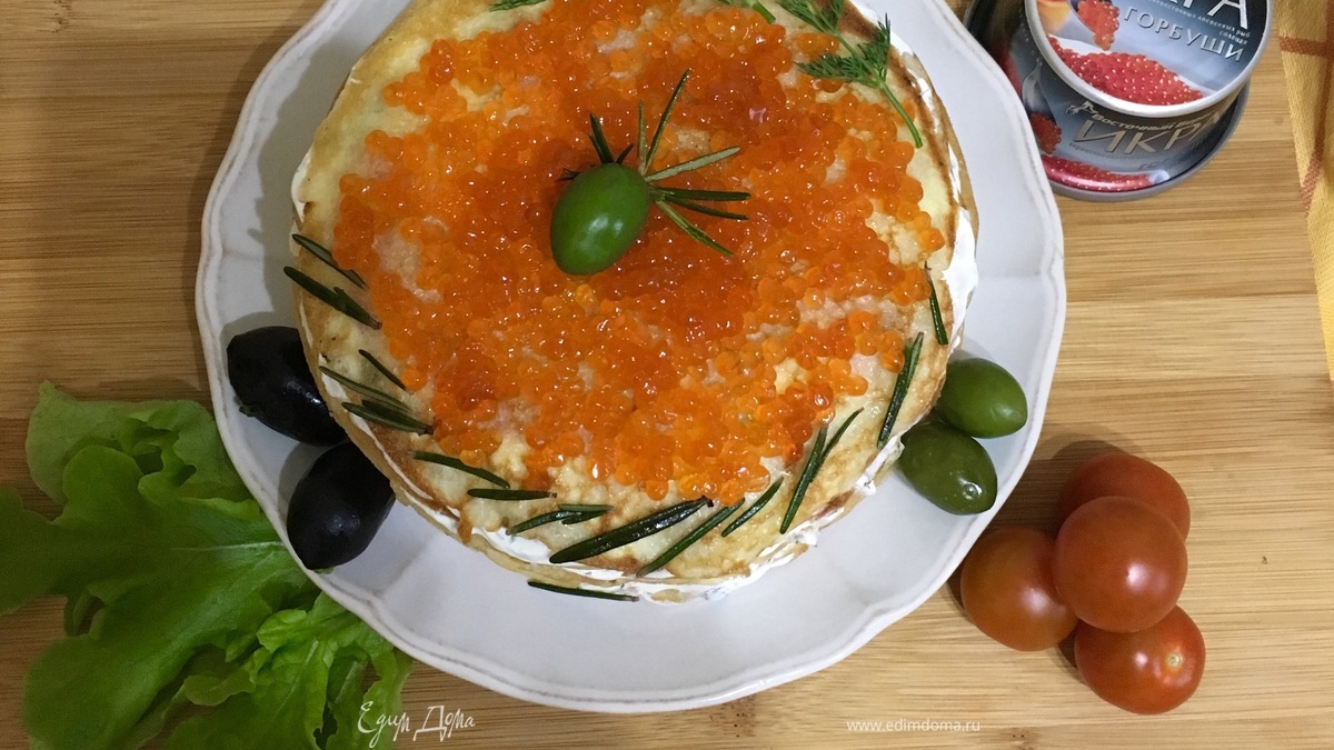Блинный торт с форелью и красной икрой