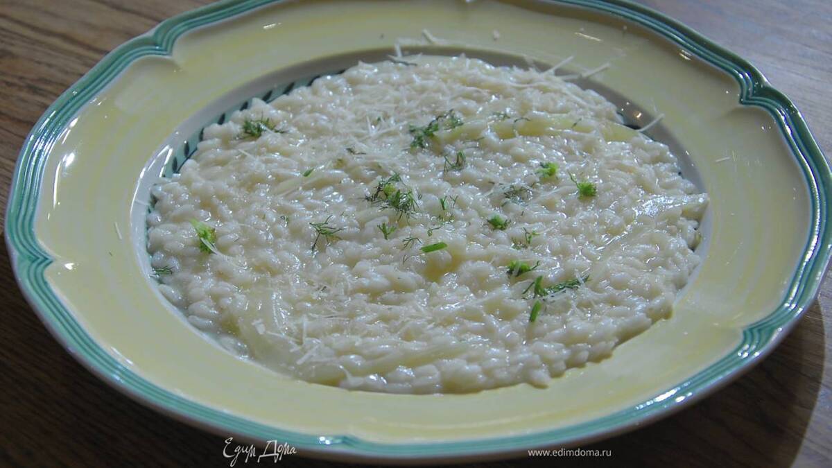 Готовое ризотто посыпать зеленью фенхеля и оставшимся сыром.