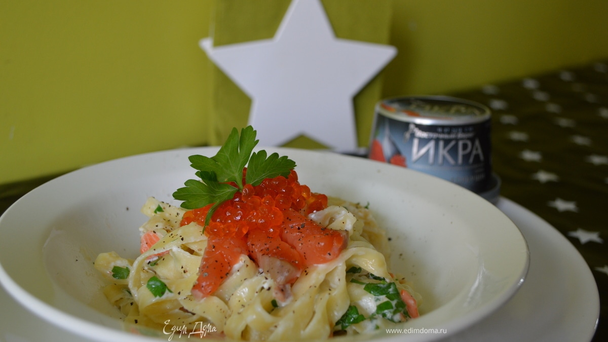 Выложить пасту на тарелку, дополнить ломтиками рыбы, красной икрой ТМ «Восточный берег». Посыпать свежемолотым черным перцем. Приятного аппетита!