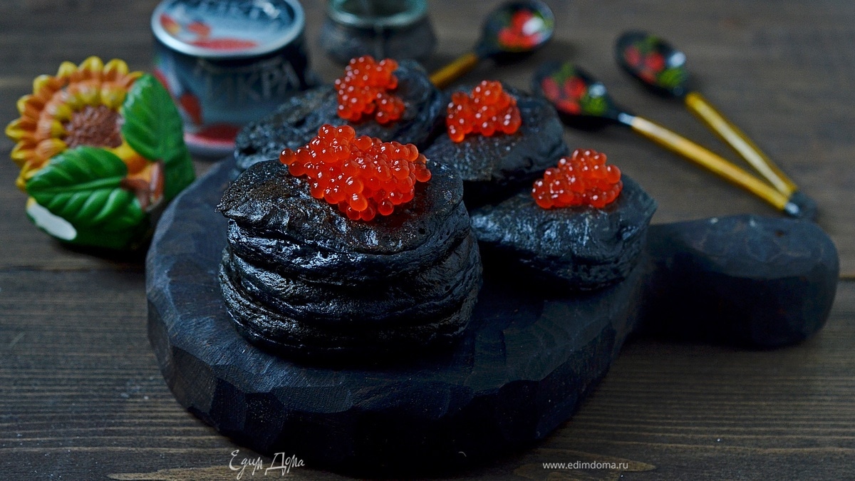 Черные оладьи с красной икрой