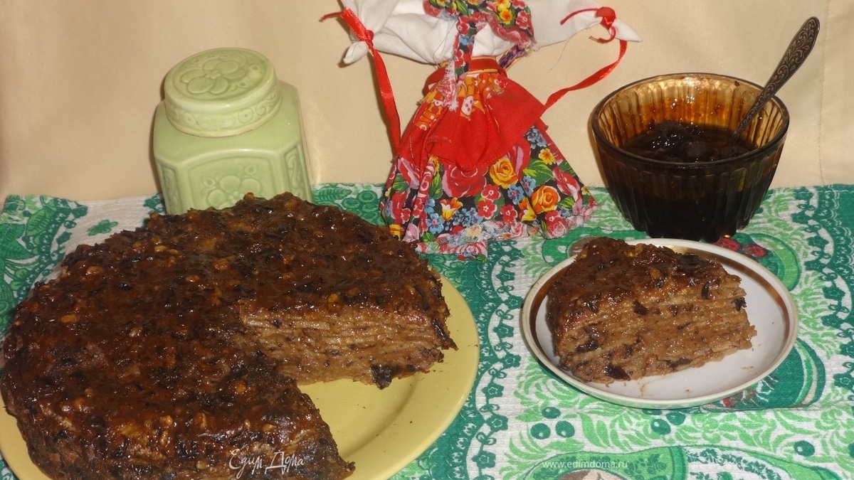 Разрезать блинный торт на порции и подать к чаю или кофе. Вкусен и в теплом, и в холодном виде. Угощайтесь! Приятного аппетита!