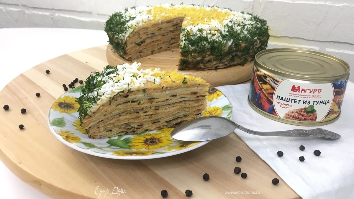 Все мы знаем о пользе рыбы и морепродуктов. Но зачастую хозяйки просто ломают голову, не зная, что же еще можно приготовить из рыбы, или, например, из рыбного паштета. Предлагаю вам авторский рецепт блинного торта с прослойками из нежного взбитого пюре на основе паштета из тунца ТМ «Магуро». Выбор хорошего и качественного паштета очень важен, так как от него будет зависеть вкус получившегося блюда. Сами блинчики готовим с добавлением ржаной муки, от этого их вкус будет еще интереснее! Ну и хочется отметить, что в разрезе наш блинный торт очень напоминает торт «Наполеон». Он получается такой же пропитанный, с множеством прослоек. Поэтому просто тает во рту! Рекомендую тем, кто любит блюда и закуски с использованием морепродуктов.