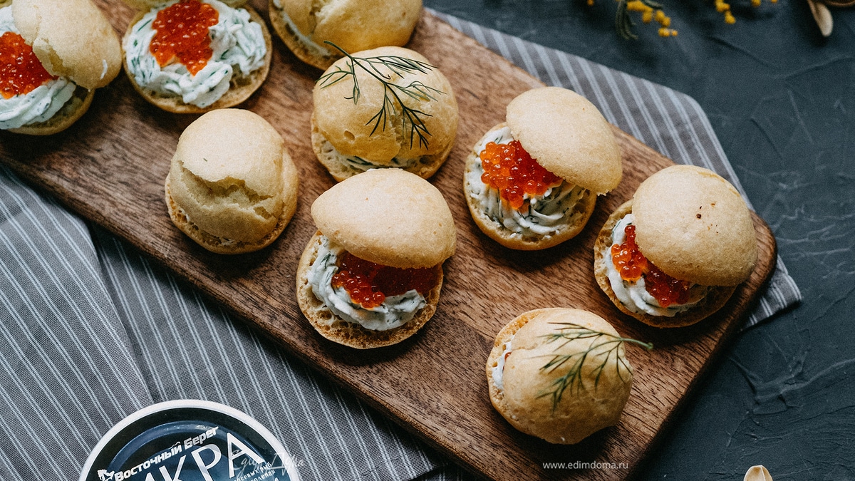 Остывшие профитроли разрезать пополам, но не до конца срезая крышечку. Положить творожную начинку в кондитерский мешок и фигурной насадкой отсадить крем на нижнюю половину, сверху положить красную икру ТМ