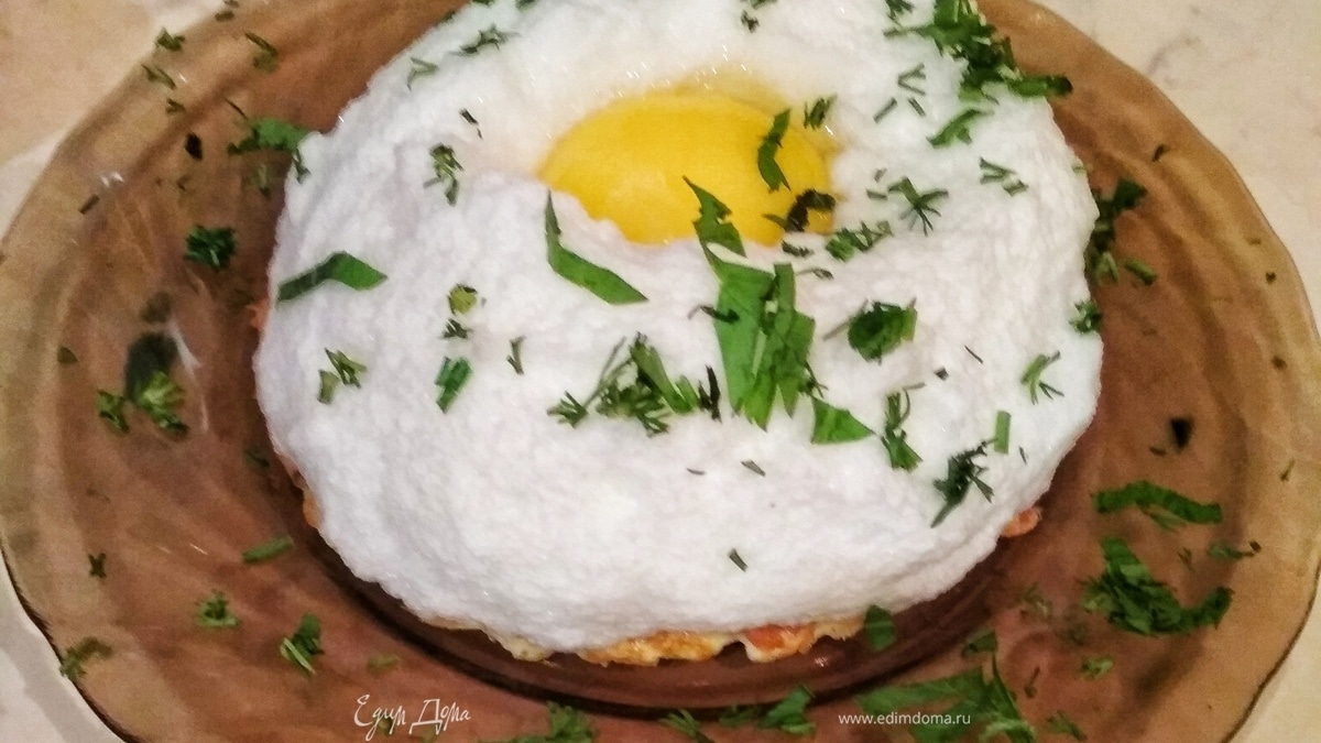 Далее переворачиваем на другую сторону. Выкладываем оставшиеся взбитые белки, делая в центре ямку (углубление). В ямку кладем желток, солим и накрываем крышкой. Держим на небольшом огне также до подрумянивания второй стороны рыбной основы, за это время белки увеличатся немного в размере и вместе с желтком приготовятся и прогреются. - Шаг 6