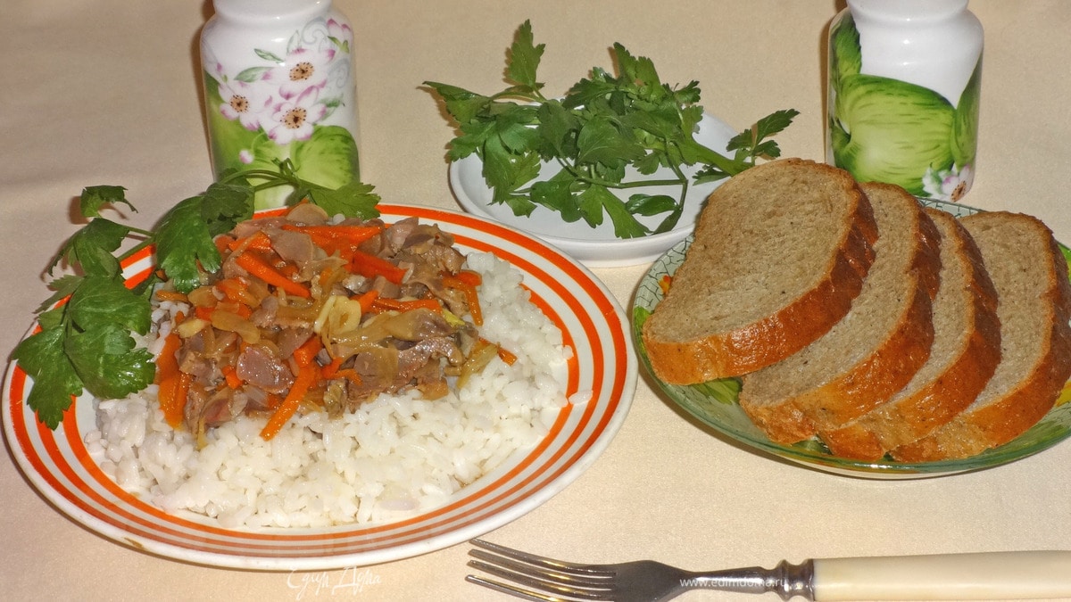 На тарелку выложить порцию риса, сверху положить куриные желудки с овощами, украсить зеленью и подать к столу. Приятного аппетита!