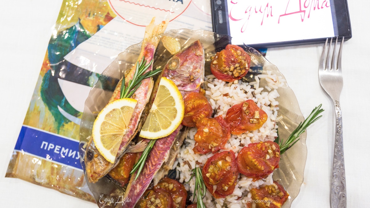 Барабулька «магуро», запеченная с помидорами, чесноком и розмарином