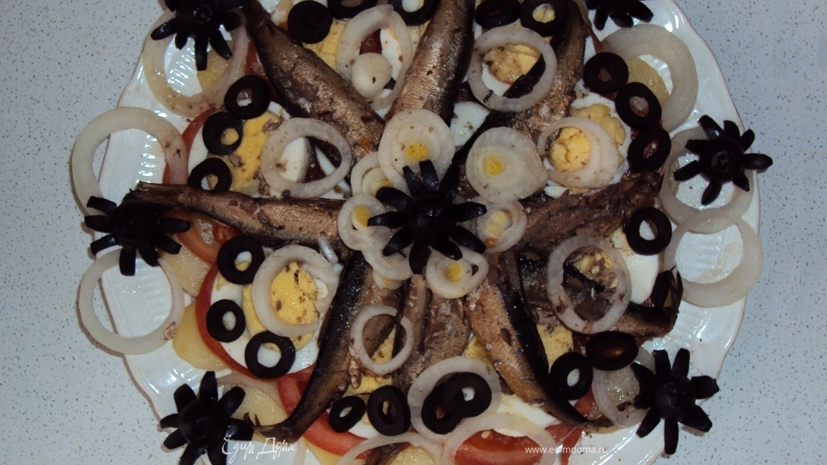 На плоское блюдо выложить слоями картофель, помидоры, шпроты, яйца. Все слои, кроме рыбы, немного посолить и поперчить. Полить салат масляно-уксусной заправкой. Украсить колечками лука, оливок и фигурками из оливок.