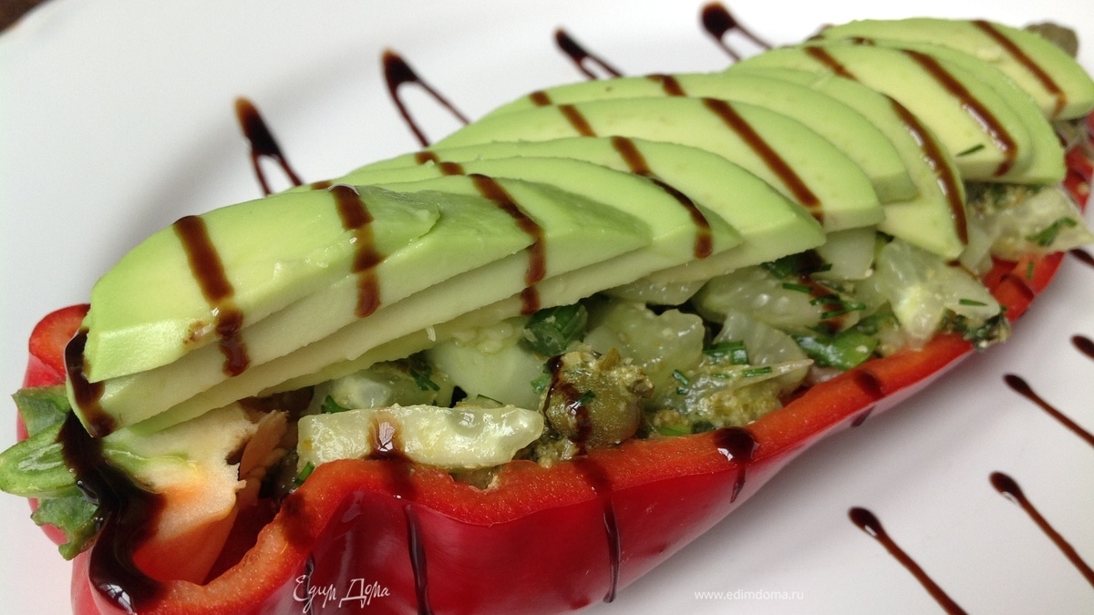 Кладу сверху на салат авокадо. В рецепте соли нет, так как ее вполне достаточно в каперсах и песто, но, если вам хочется, добавьте. - Шаг 9
