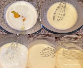 Духовку нагреть до 180°C. Форму 28х22 см слегка смазать маслом и посыпать мукой. Тесто: все продукты должны быть комнатной температуры. В миске хорошо взбить венчиком кефир, майонез, яйца, соль и сахар. Добавляем просеянную с содой и разрыхлителем муку и опять хорошо перемешиваем венчиком. По консистенции тесто получается жидким и напоминает тесто на оладьи.